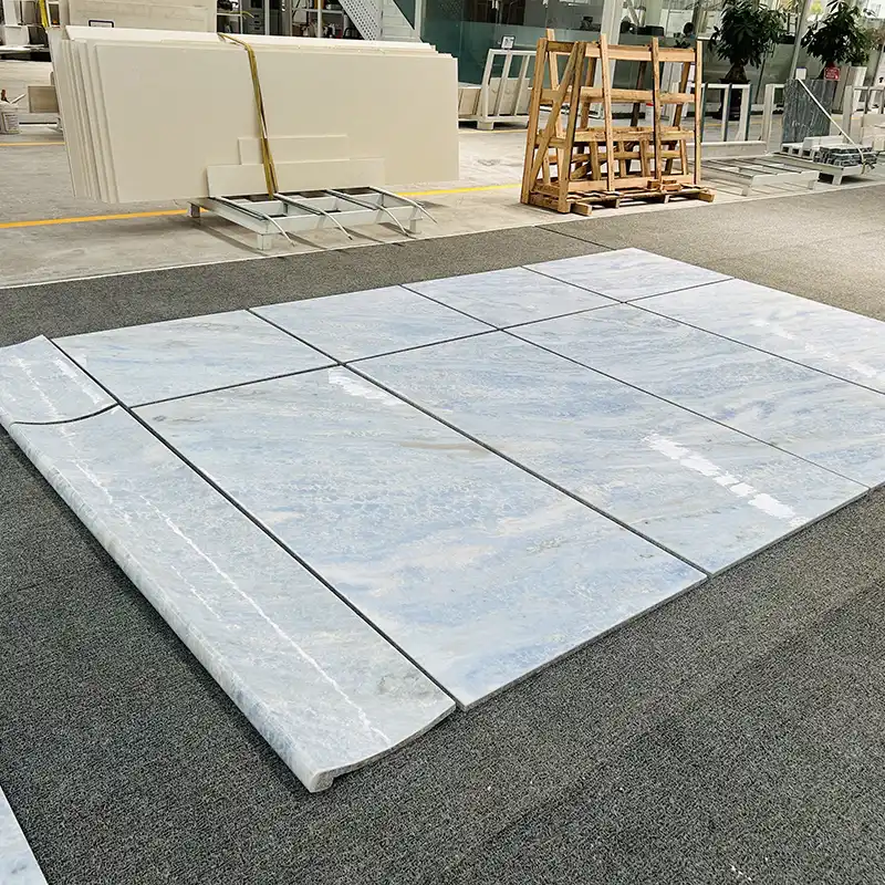 Les carreaux de mur en marbre bleu de calcite ont une couleur bleu fraîche vif avec des veines équilibrées et en cristal, contrairement à de nombreuses billes bleues plus foncées ou trop à motifs. Cela rend l'intérieur plus léger et plus calme tout en ayant l'air chic.