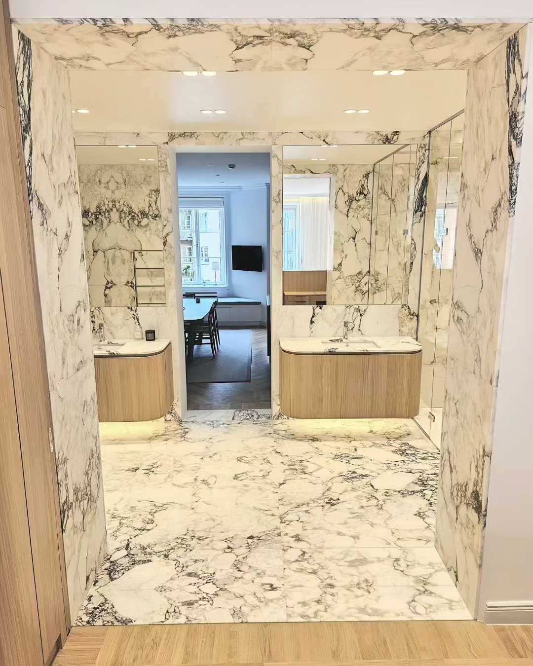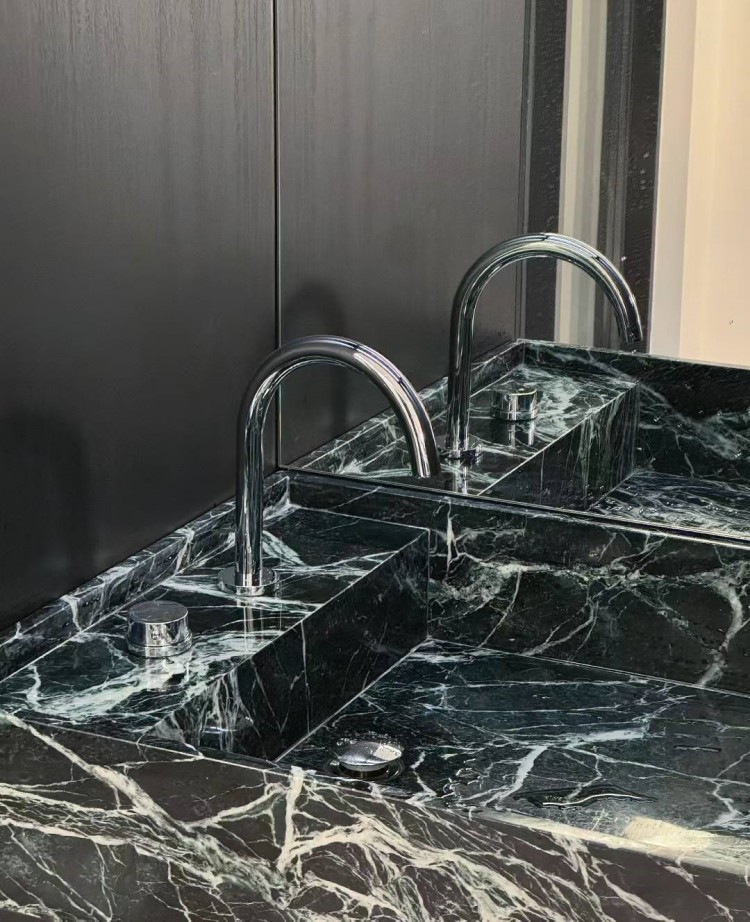 Stone est utilisée de manière plus créative maintenant. Les concepteurs l'aiment aussi pour les meubles - comme untable basse en marbre noir, étagères personnalisées, ou même vanités de salle de bain. Ces détails apportent du caractère et un bord moderne à une maison moderne en pierre sans être au-dessus.