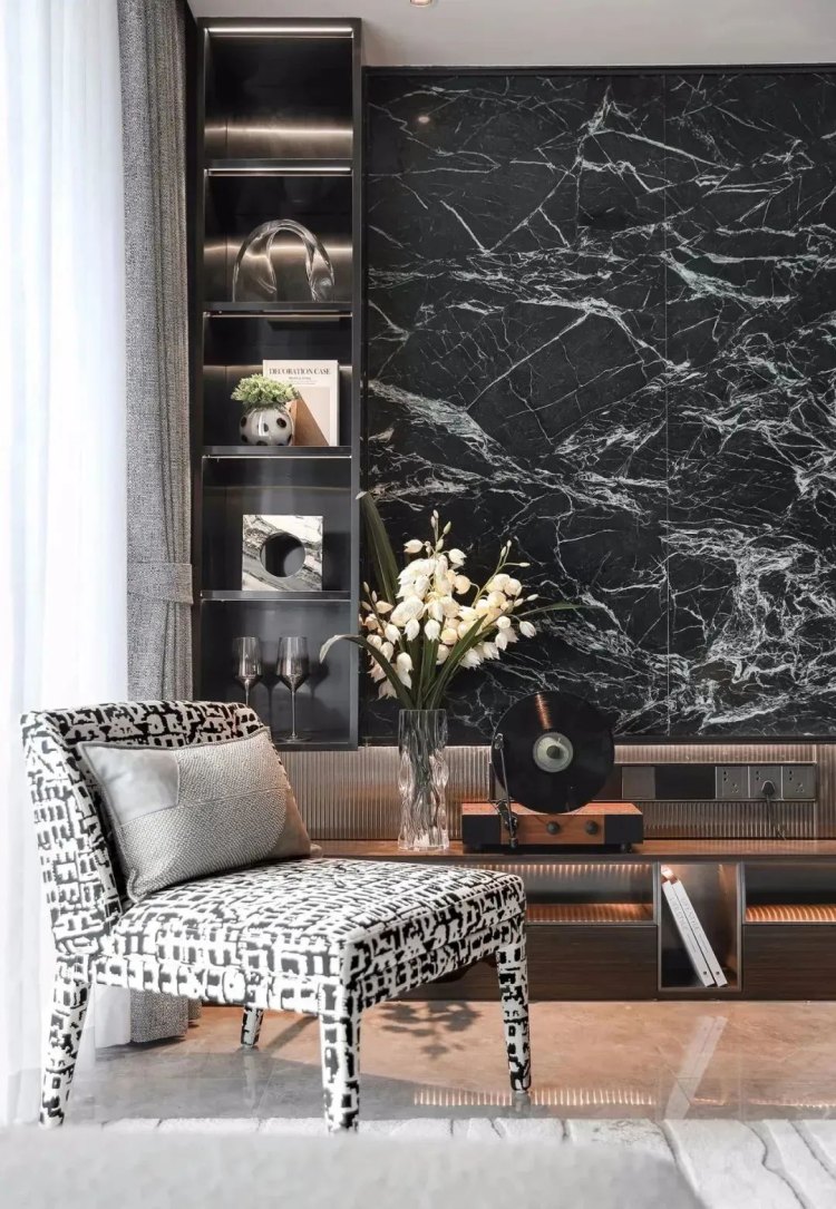 Une pièce est immédiatement rendue plus dramatique et élégante par l'utilisation du marbre noir. Il a fière allure sur les planchers, les cadres de porte ou les pièces d'accentuation avec des arrière-plans sombres et des veines accrocheuses. Utilisez-le avec parcimonie parce que trop de noir peut occasionnellement donner à une pièce une sensation froide ou lourde.