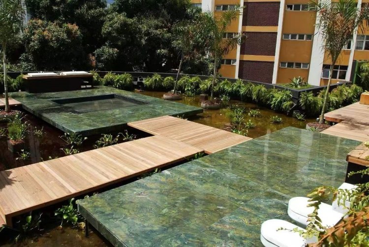 Il y a un peu du monde extérieur apporté avec du marbre vert. Il est idéal pour produire un sanctuaire paisible dans la maison en raison de ses motifs denses et de ses couleurs de forêt. Il est apaisant et naturel après une longue journée de travail.