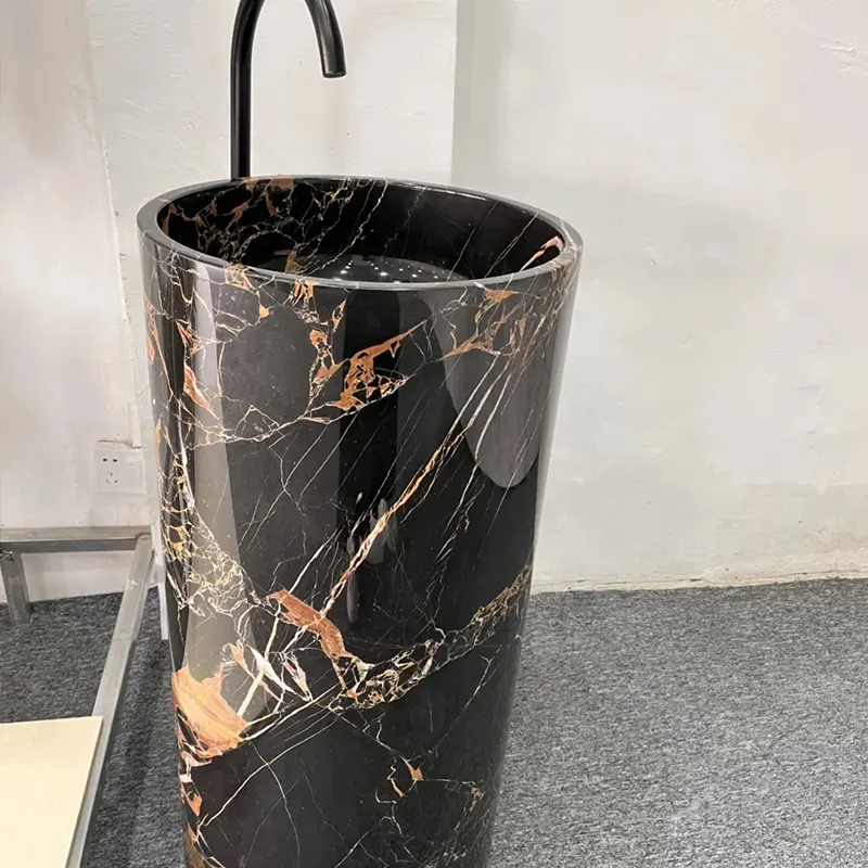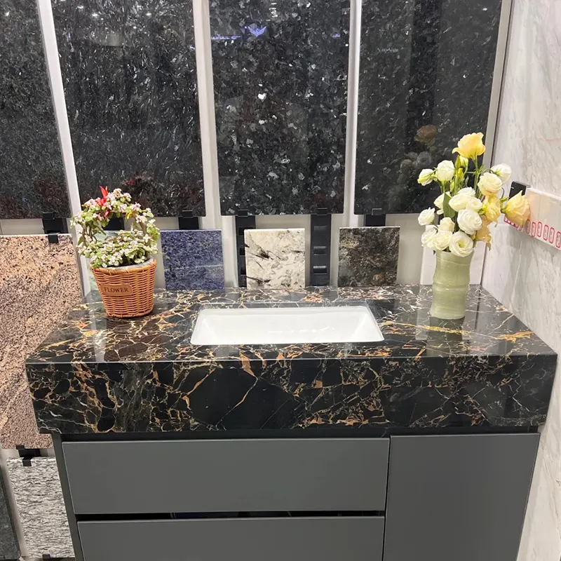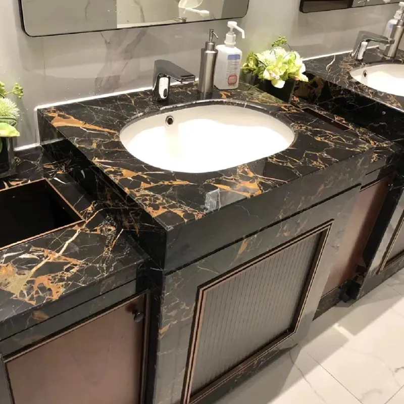 Si vous voulez un look de spa haut de gamme, le marbre d'or Portoro est un excellent choix. Les concepteurs l'utilisent fréquemment pour les vanités de salle de bain en marbre noir, les accessoires de salle de bain en marbre noir ou les revêtements en marbre noir entiers. L'or et le noir ensemble font un espace calme mais luxueux.